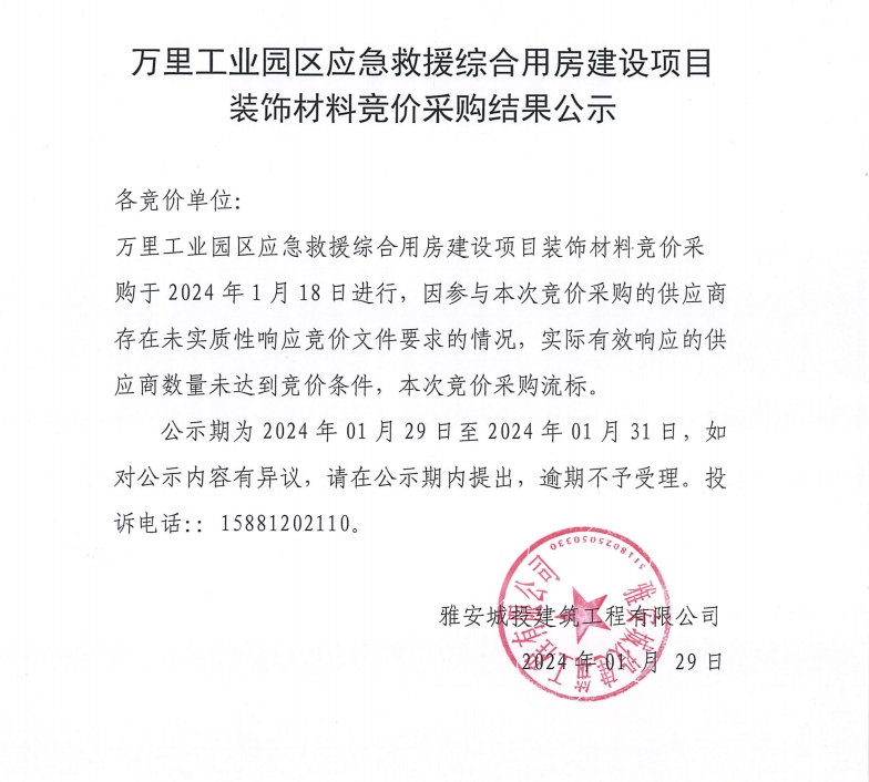 萬里工業園區應急救援綜合用房建設項目裝飾材料競價采購結果公示