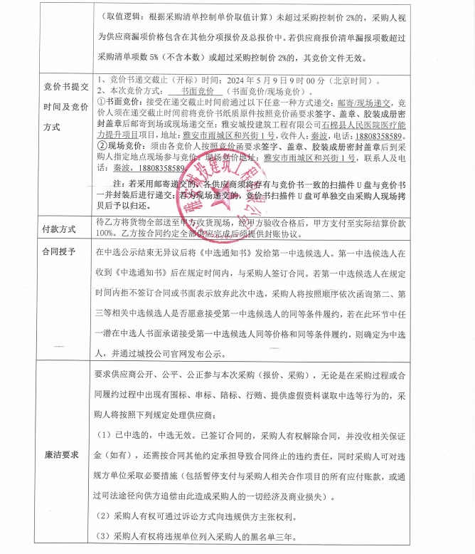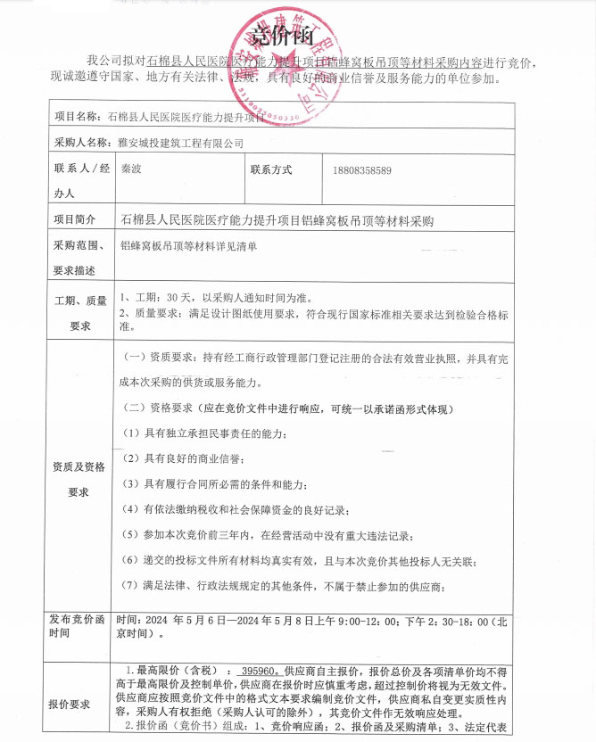 石棉縣人民醫院醫療能力提升項目鋁蜂窩板吊頂等材料采購內容競價公告