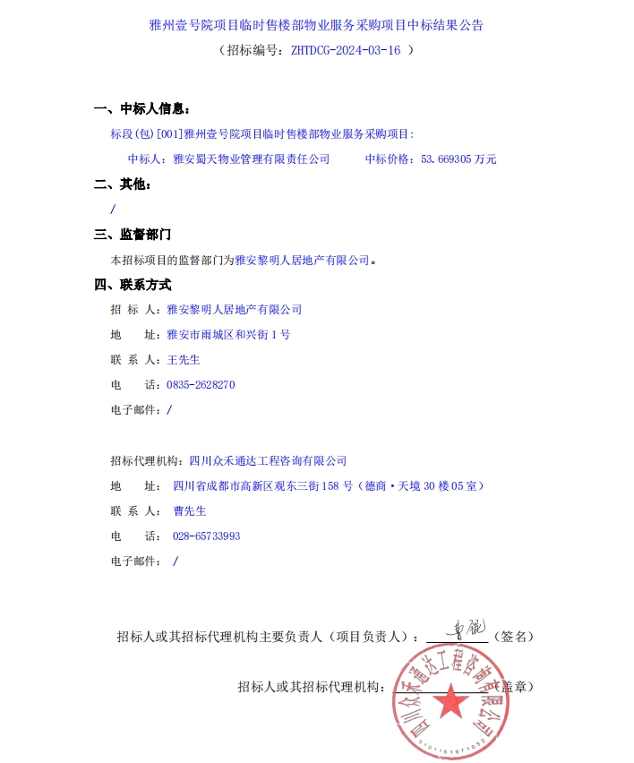雅州壹號院項目臨時售樓部物業服務采購項目中標結果公告