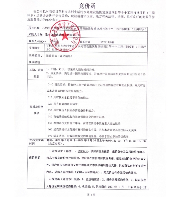 石棉縣草科鄉農村生活污水處理設施恢復重建項目等十個工程打捆項目(王崗坪鄉)道路井蓋競價公告