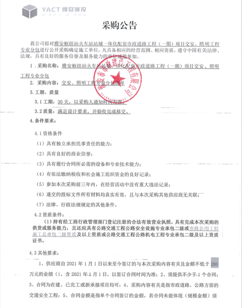 雅安樞紐站火車站站城一體化配套市政道路工程(一期)項目交安、照明工程專業分包采購公告
