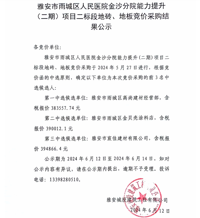 雅安市雨城區人民醫院金沙分院能力提升(二期)項目二標段地磚、地板競價采購結果公示