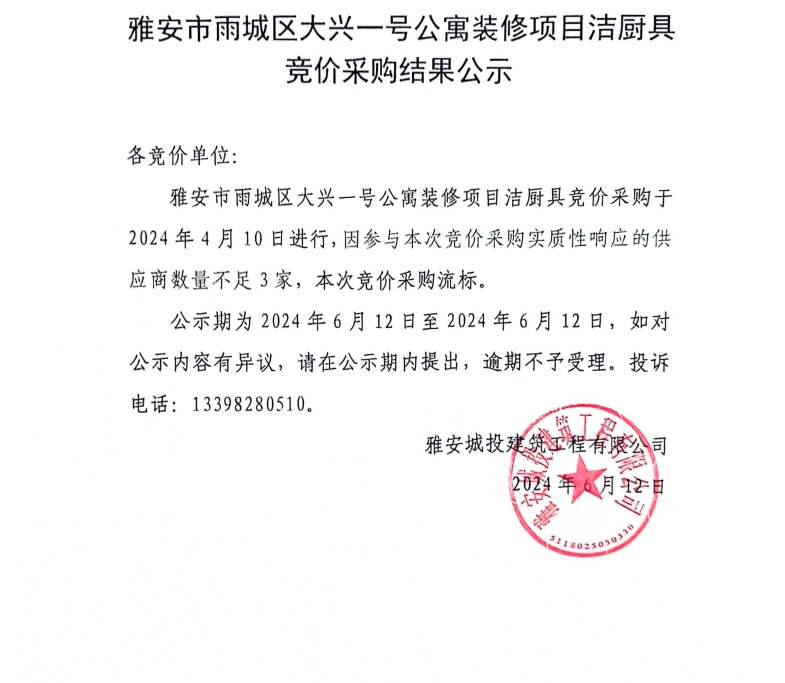 雅安市雨城區大興壹號公寓裝修項目潔廚具競價采購結果公示