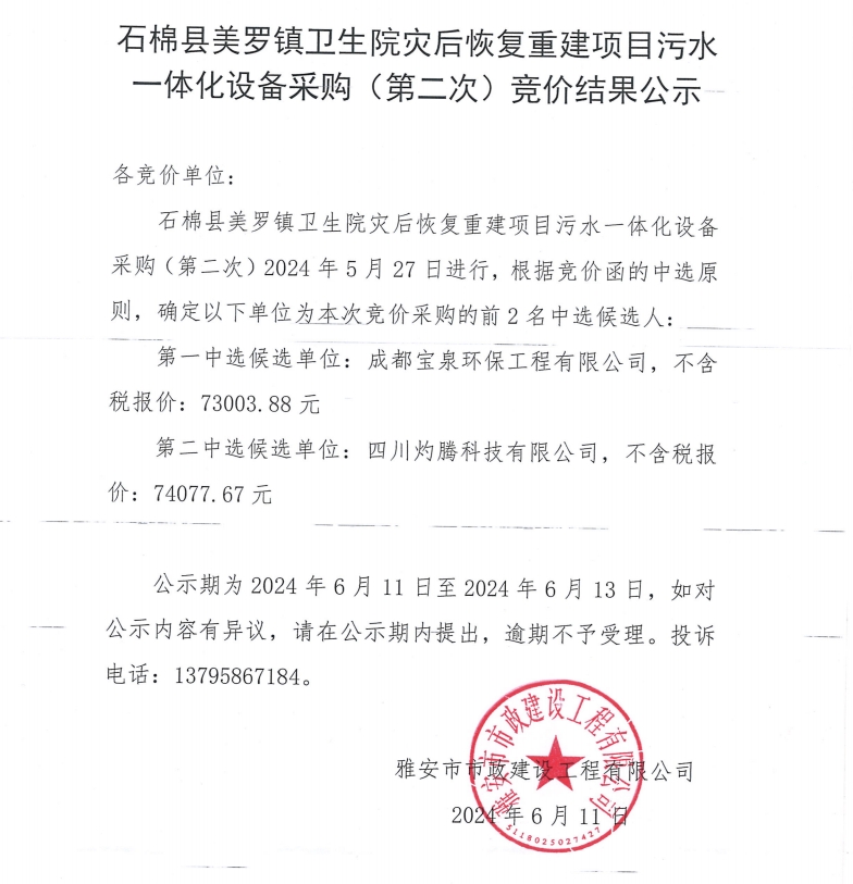 石棉縣美羅鎮衛生院災后恢復重建項目污水一體化設備材料采購(第二次)競價結果公示