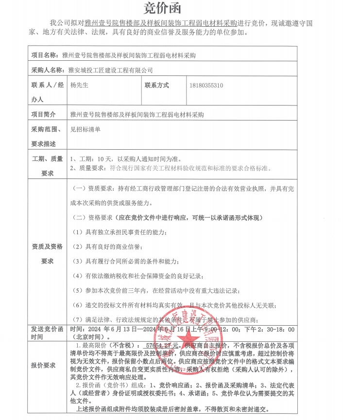雅州壹號(hào)院售樓部及樣板間裝飾工程弱電材料采購(gòu)競(jìng)價(jià)公告
