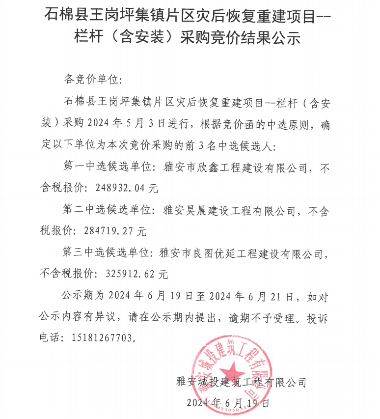 石棉縣王崗坪集鎮片區災后恢復重建項目--欄桿(含安裝)采購競價結果公示
