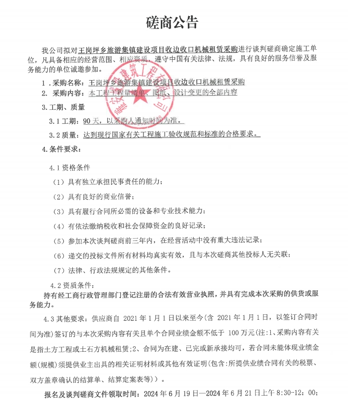王崗坪鄉(xiāng)旅游集鎮(zhèn)建設(shè)項(xiàng)目收邊收口機(jī)械租賃采購談判磋商公告