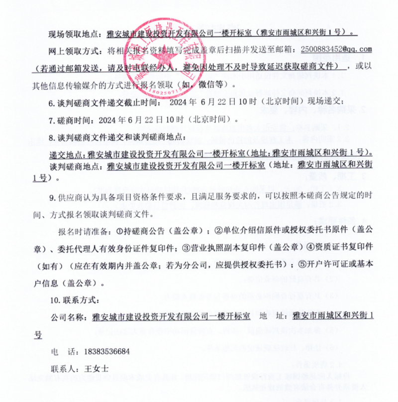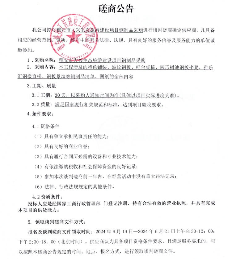 雅安市大興生態旅游建設項目鋼制品采購談判磋商公告