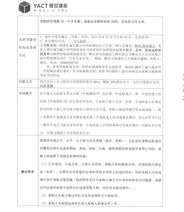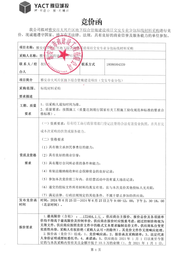 雅安市大興片區地下綜合管廊建設項目交安專業分包標線材料采購競價公告