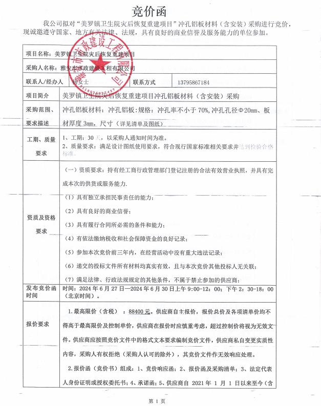 石棉縣美羅鎮衛生院災后恢復重建項目沖孔鋁板材料(含安裝)采購競價公告