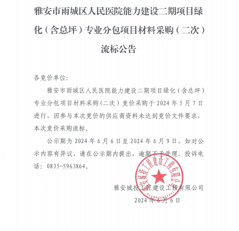 雅安市雨城區人民醫院能力建設二期項目綠化(含總坪)專業分包材料采購(二次)流標公告