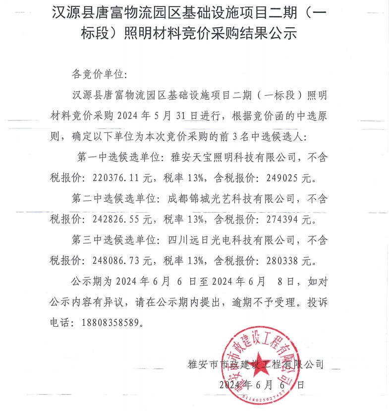 漢源縣唐富物流園區(qū)基礎(chǔ)設(shè)施項(xiàng)目二期(一標(biāo)段)照明材料競(jìng)價(jià)采購(gòu)結(jié)果公示
