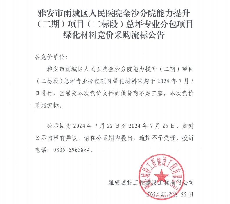 雅安市雨城區人民醫院金沙分院能力提升(二期)項目(二標段)總坪專業分包項目綠化材料競價采購流標公告