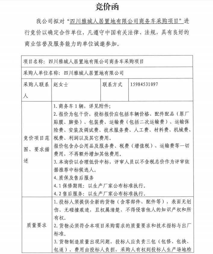 四川雅城人居置地有限公商務(wù)車采購項(xiàng)目競(jìng)價(jià)公告