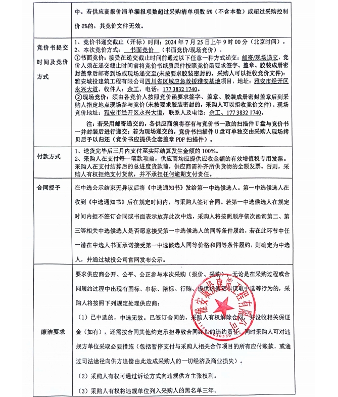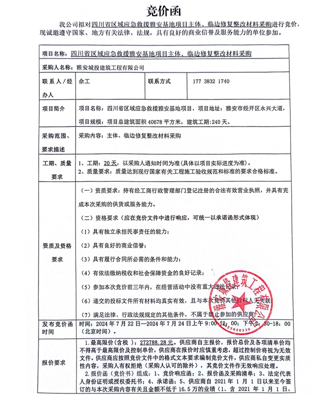 四川省區域應急救援雅安基地項目主體、臨邊修復整改材料采購競價公告
