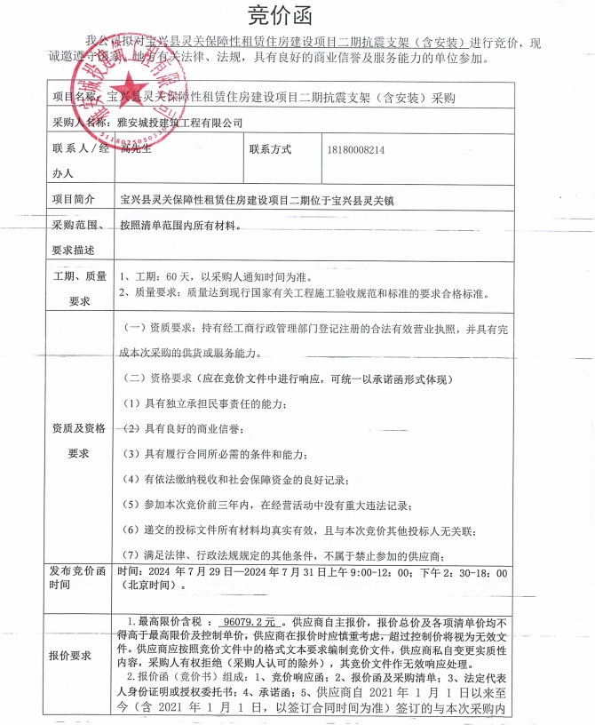 寶興縣靈關保障性租賃住房建設項目二期抗震支架(含安裝)采購競價公告