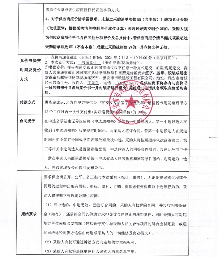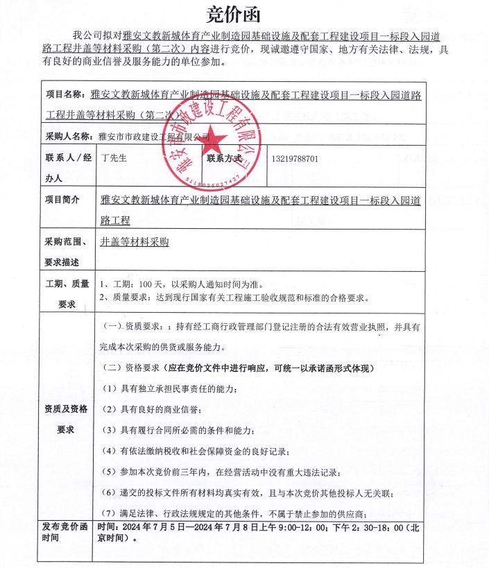 雅安文教新城體育產業制造園基礎設施及配套工程建設項目一標段入園道路工程井蓋等材料采購(第二次)競價公告