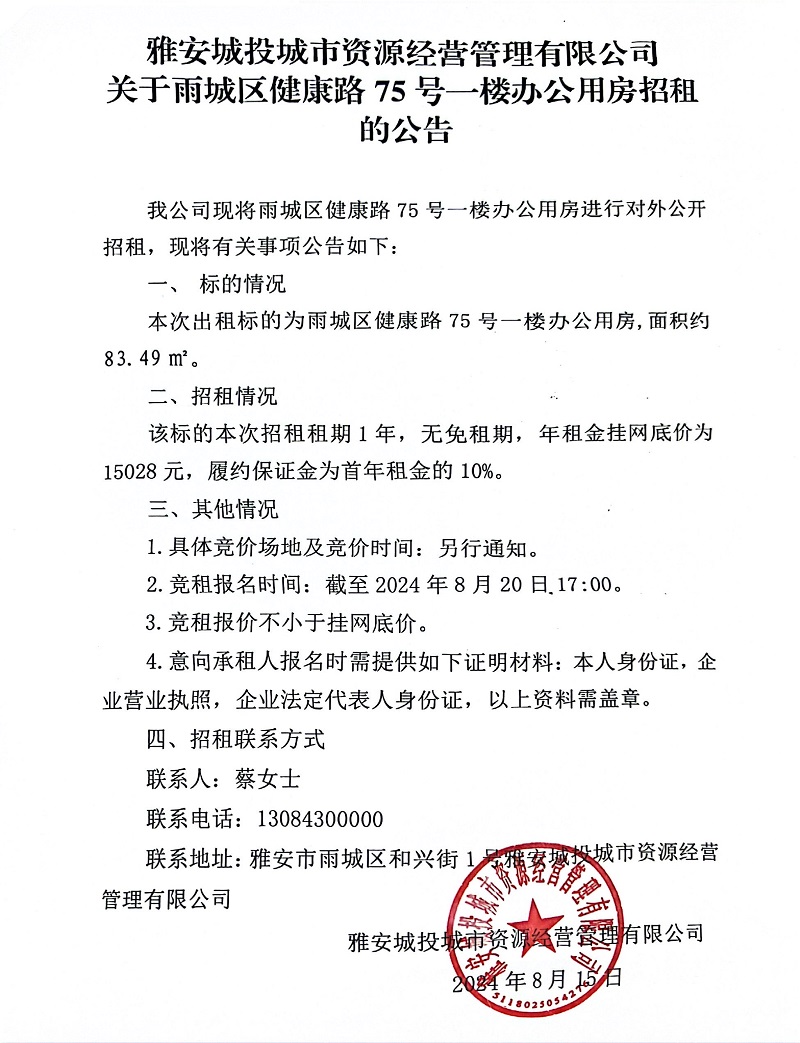 雅安城投城市資源經營管理有限公司關于雨城區(qū)健康路75號一樓辦公用房招租的公告