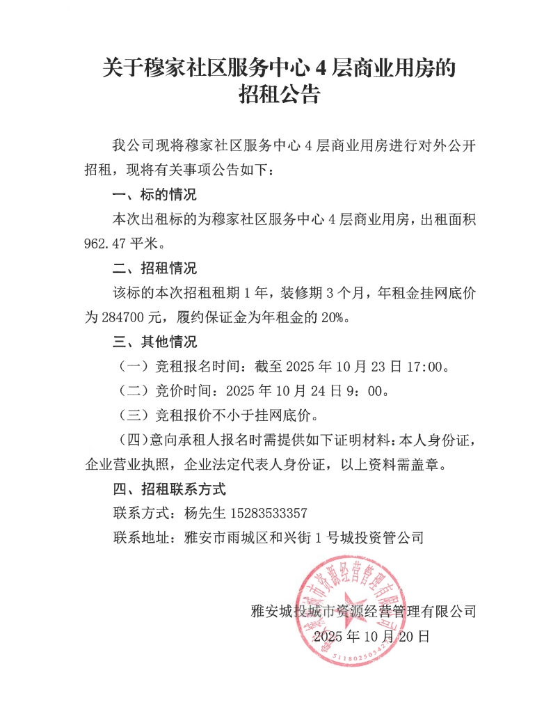 關(guān)于穆家社區(qū)服務中心4層商業(yè)用房的招租公告
