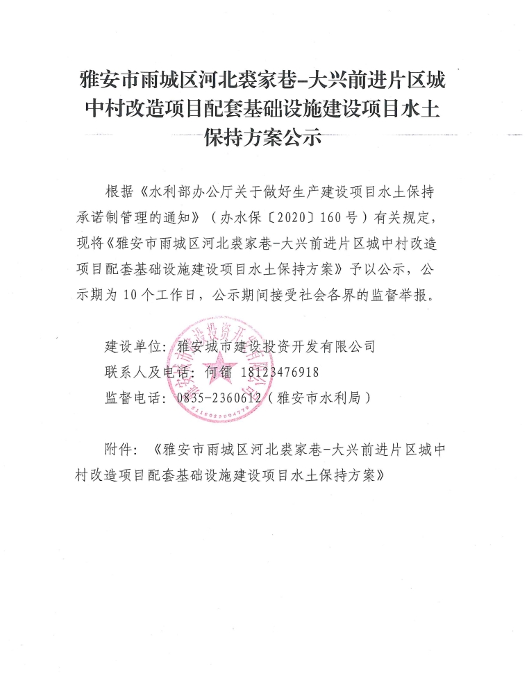 雅安市雨城區河北裘家巷-大興前進片區城中村改造項目配套基礎設施建設項目水土保持方案公示