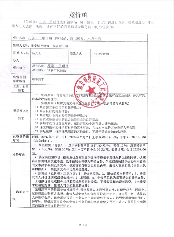 花襄·里項目廢舊鋼制品、廢舊模板、 木方出售競價函