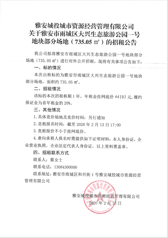 雅安城投城市資源經營管理有限公司關于雅安市雨城區大興生態旅游公園一號地塊部分場地(735.05㎡)的招租公告
