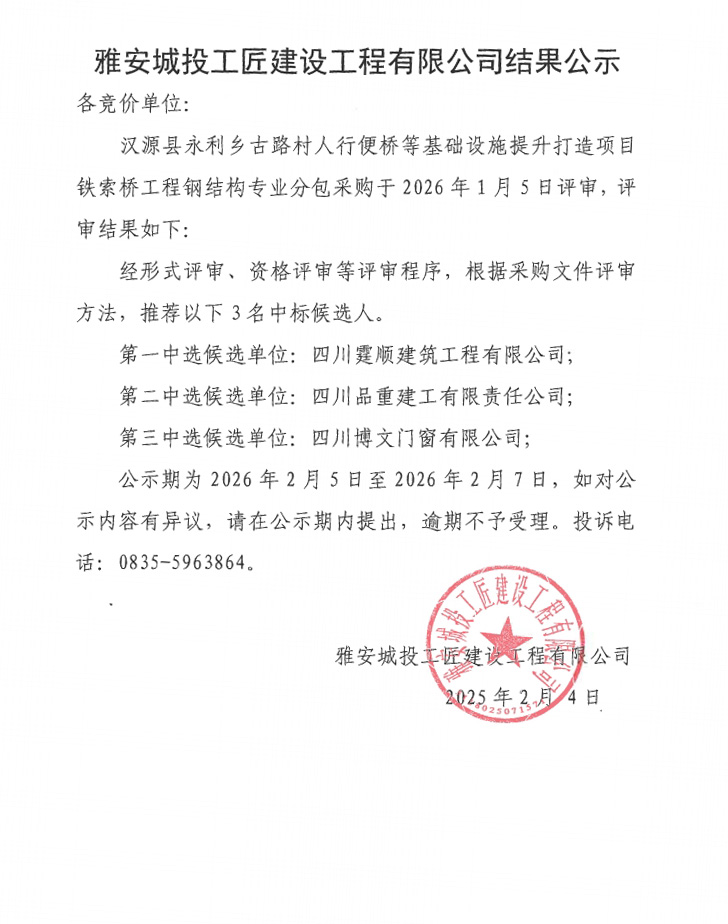 漢源縣永利鄉(xiāng)古路村人行便橋等基礎(chǔ)設(shè)施提升打造項(xiàng)目鐵索橋工程鋼結(jié)構(gòu)專(zhuān)業(yè)分包采購(gòu)結(jié)果公示