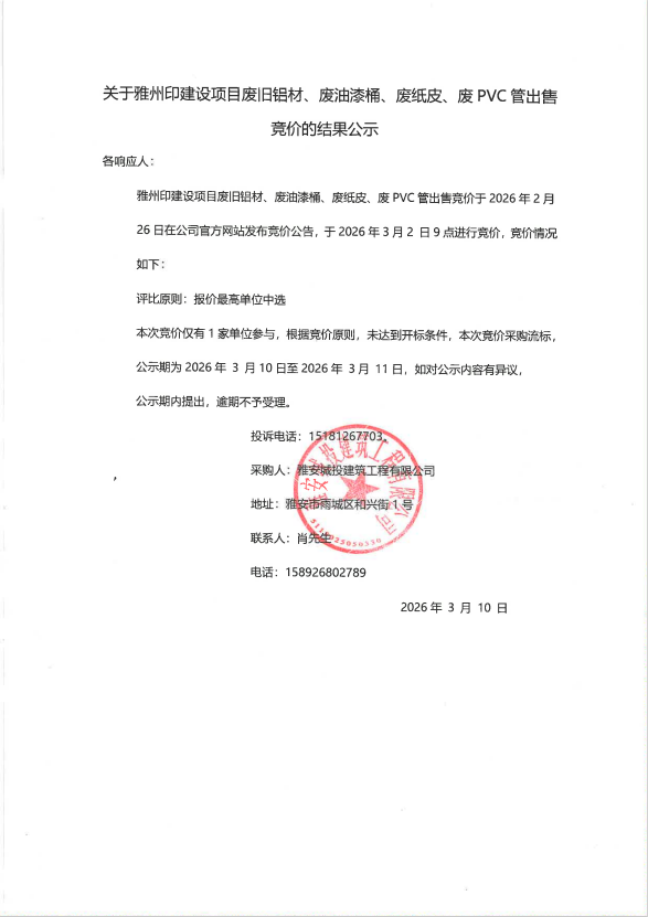 關于雅州印建設項目廢舊鋁材、廢油漆桶、廢紙皮、廢PVC管出售競價的結果公示